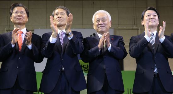 하지만 국민의당 ‘오너’ 격인 안철수(사진 맨 오른쪽) 상임공동대표는 “(통합 거부라는) 생각에 변함이 없다”며 선을 그었다.