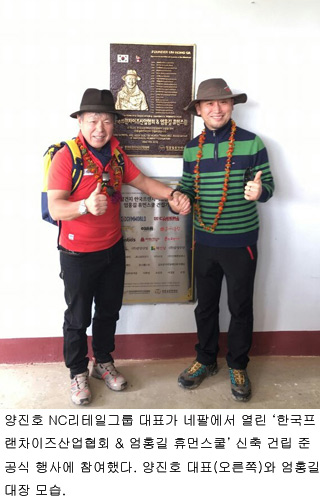 [쿠키뉴스=박주호 기자] 국내 액세서리 프랜차이즈 브랜드 ‘못된고양이’를 운영하고 있는 NC리테일그룹 양진호 대표가 네팔에서 열린 ‘한국프랜차이즈산업협회 & 엄홍길 휴먼스쿨’ 신축 건립 준공식 행사에 참여했다.