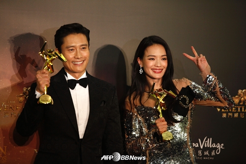 17일 마카오에서 열린 AFA에서 영화 ‘내부자들’에 출연한 이병헌이 견자단, 나가세 마사토시, 펑 샤오강을 제치고 남우주연상을 받았다.