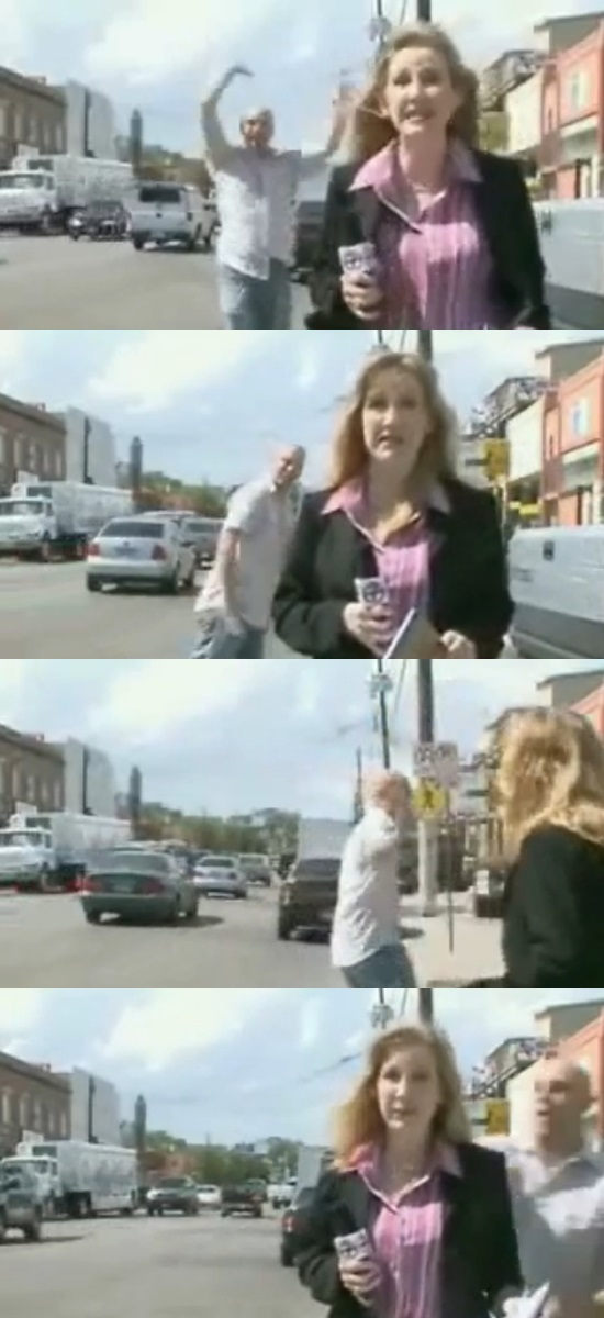 한창 뉴스 기사를 전하던 이 여성기자 뒤로 웬 남성이 카메라를 향해 손짓을 하는데요.