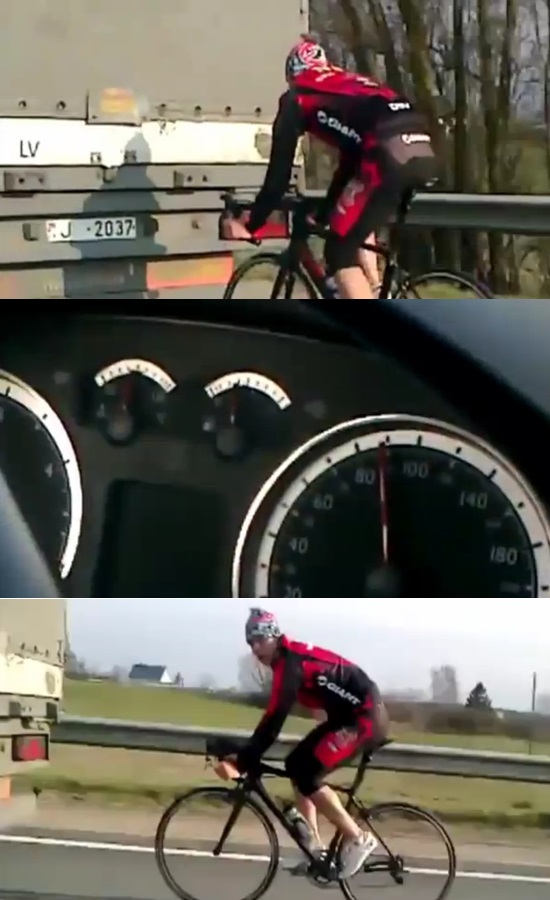 [쿠키뉴스=콘텐츠기획팀] 편도 2차선의 자가용 전용도로, 끝 차선을 달리고 있는 트럭 뒤로 웬 사이클 한 대가 눈에 띕니다.
