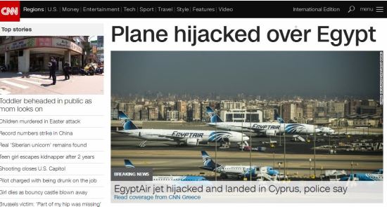 29일(한국시간) 블룸버그 통신 등에 따르면 이집트항공 대변인은 이집트 알렉산드리아에서 출발해 카이로로 가던 항공기가 공중납치됐다고 밝혔다. 이 항공기는 이후 키프로스의 라르나카 공항에 착륙했다.