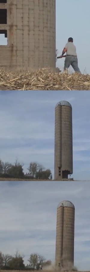 한참 벽돌을 부숴 나가던 남성, 저장소 밑동이 어느새 절반 가까이 깎여나가자 간신히 버티고 있던 저장소가 순식간에 무너지는데...