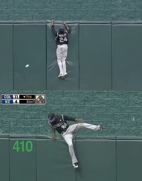 콜로라도 수비수 파울러가 공을 끝까지 따라가 펜스 위로 점프를 해보지만, 공을 잡아내지는 못하는데...