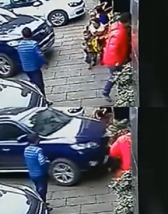 그때 이들 모자 앞으로 SUV 차량 한 대가 주차하기 위해 서서히 접근해오는데, 혹시나 하는 마음에 위협을 느낀 엄마는 반사적으로 아들을 품듯이 자신의 뒤편으로 이동시켜 보호하려합니다.