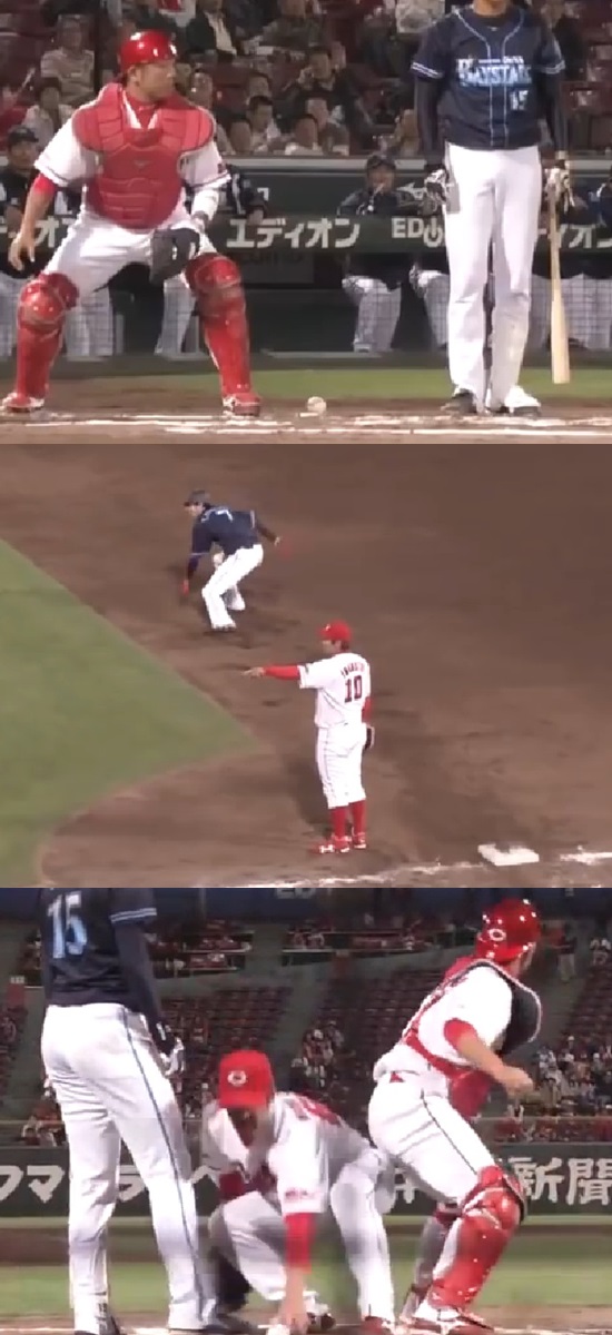 [쿠키뉴스=콘텐츠기획팀] 일본 프로야구 히로시마 대 요코하마의 경기 중 포수의 속임수로 주자가 속는 재미난 영상이 눈길을 끕니다.
