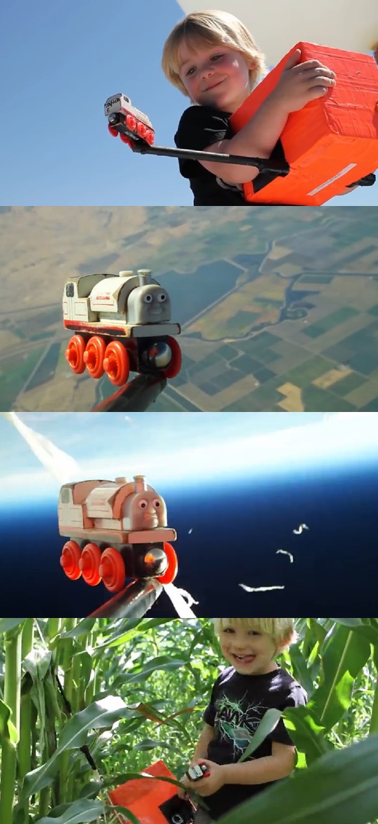 무려 지상으로부터 18마일에 근접할 즈음, 아쉽게도 터져버리는 풍선에 이내 곤두박질치던 토마스 기차는 다행히 GPS에 의해 안전하게 아들의 손으로 무사 귀환됩니다.