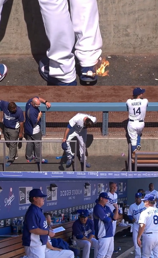 하지만 원인을 찾지는 못하고 또 자꾸만 두리번두리번... 이내 자신의 발에 불이 붙은 걸 발견한 순간, 이미 다저스의 덕아웃은 박장대소!
