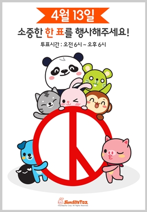 [쿠키뉴스=이다니엘 기자] 선데이토즈(대표 이정웅)가 20대 국회의원 선거의 유권자 투표를 응원하는 모바일 캠페인을 펼친다고 12일 밝혔다.