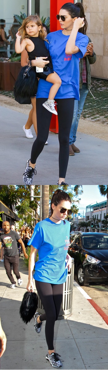 켄달 제너는 심플한 티셔츠와 블랙 레깅스로 늘씬한 몸매와 패션 감각을 뽐냈는데요.