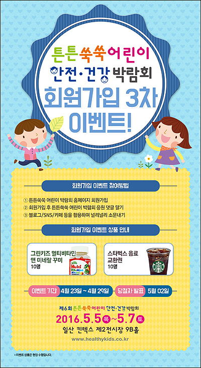 [쿠키뉴스=박주호 기자] 오는 5월 5일 어린이날 개최되는 ‘튼튼쑥쑥 어린이 안전·건강 박람회’가 3차 회원가입 이벤트를 진행한다.