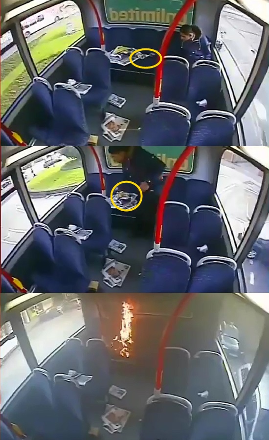 그리고는 잠시 뒤 버스에서 내리기 전 전단지 뭉치로 불이 옮겨 붙도록 하는데요.