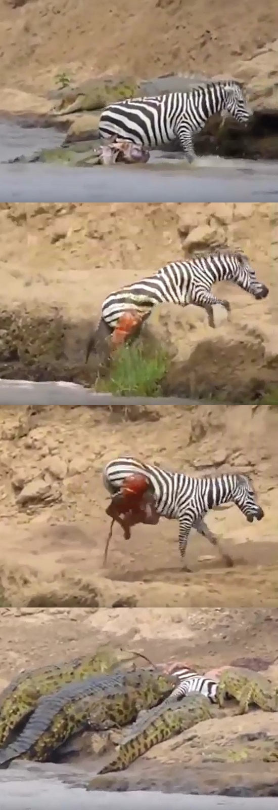 [쿠키뉴스=콘텐츠기획팀] 얼룩말 한 녀석이 강을 채 건너기도 전에 악어에게 습격을 당해 뒷다리가 물린 상황이네요.