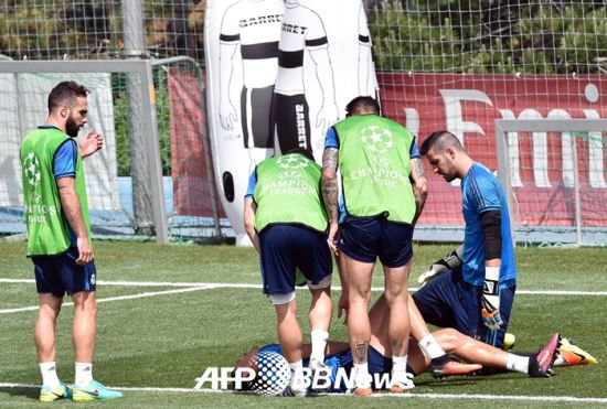 [쿠키뉴스=이다니엘 기자] 레알 마드리드 공격수 호날두가 연습 경기 중 쓰러져 고통을 호소하고 있다.