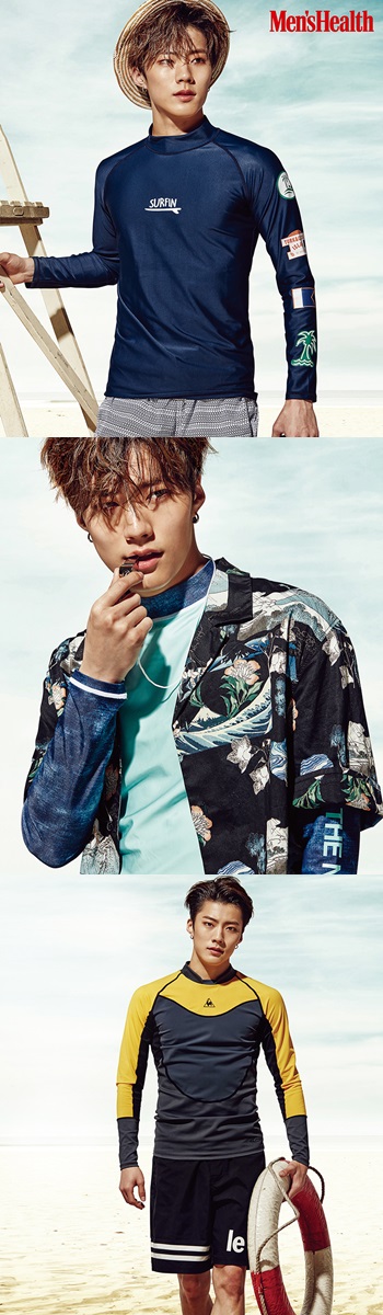 수상 구조대 콘셉트로 변신한 제업은 레쉬가드와 리조트 룩을 선보이며 에너지틱한 포즈로 화보의 완성도를 높였습니다.