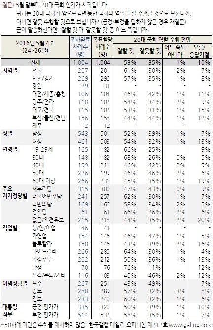 [쿠키뉴스=이다니엘 기자] 오는 5월 30일부터 시작되는 ‘여소야대’ 제20대 국회에 대해 53%는 '잘할 것', 35%는 '잘못할 것'으로 봤고 11%는 의견을 유보했다. 2016년 5월 넷째 주 한국갤럽이 2016년 5월 넷째 주(24~26일) 전국 성인 1004명을 대상으로 조사한 결과에 따른 것이다.