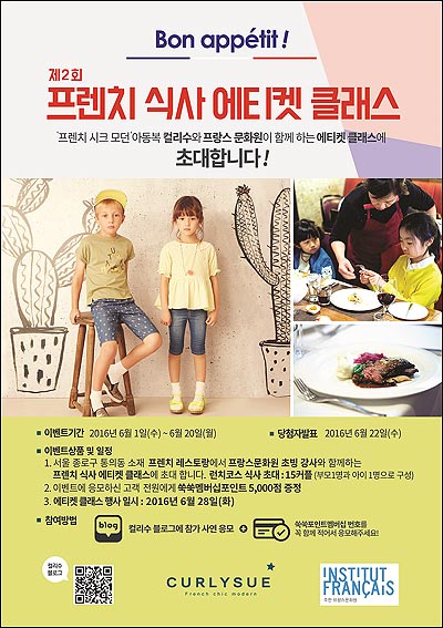 [쿠키뉴스=박주호 기자] 국내 유아동복 기업 한세드림의 프렌치 시크 모던 감성 브랜드 ‘컬리수’가 프랑스문화원과 함께하는 ‘제2회 프렌치 식사 에티켓 클래스’ 참가자를 모집한다고 1일 밝혔다.