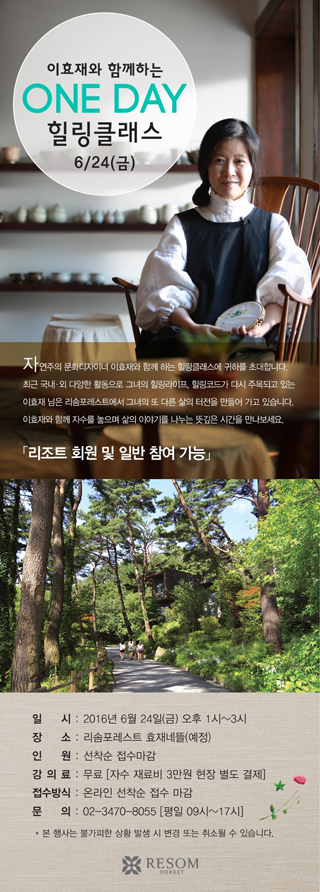 [쿠키뉴스=김진환 기자] 리솜포레스트가 자연주의문화디자이너 이효재와 함께하는 ‘원데이 힐링클래스’를 연다. 24일 오후 1시부터 약 2시간 동안 펼쳐질 이번 클래스에서는 살림전문가 효재와 함께 얘기를 나누며 자수를 놓는 특별한 시간이 마련된다.