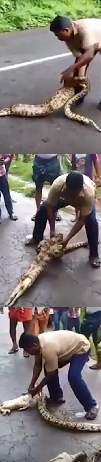 구렁이의 부푼 배를 주둥이로 밀어 올려 먹어치운 먹잇감을 토해내도록 하는데...