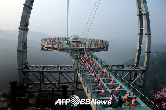 ‘세계 요가의 날’을 맞아 21일(현지시간) 중국 베이징에 위치한 32.8m 높이의 유리로 된 관광용 전망대 스린샤(石林峽, 석림협)에서 수백 명의 요가 애호가들이 모여 진풍경을 연출하고 있다. 세계 요가의 날은 요가를 널리 알리기 위해 유엔이 2014년 공식 제정, 선포했다.