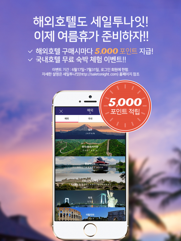 세일 투나잇은 론칭 기념으로 해외숙박 5만원 이상 구매건당 5000포인트를 적립금으로 지급하는 이벤트를 진행한다. 또한 스카이파크 킹스타운 호텔 무료 숙박 이벤트도 함께 진행한다. 론칭기념 이벤트는 다음 달 31일까지 진행된다.