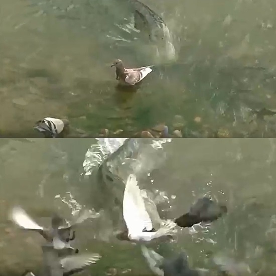 헌데 신기하게도 여기 제법 자라 몸길이가 상당한 메기가 비둘기를 사냥하는 장면이 포착됐습니다.