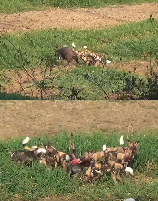 꼬리가 물린 채로 버티다 중심을 잃은 니알라를 순식간에 덮치는 들개들, 게다가 냄새를 맡고 쫓아온 다른 녀석들까지 떼로 덮치면서 덩치 큰 니알라의 형체는 온데간데없이 삽시간에 해체가 돼버립니다. 정힘찬 콘텐츠에디터 [출처=유튜브 Andrew Stegmann]