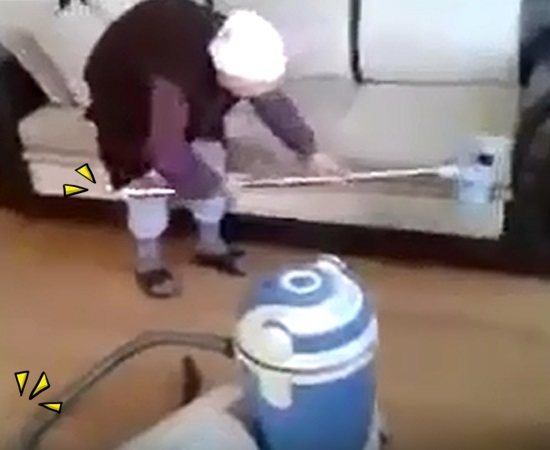 청소기로 구석구석 먼지를 제거(?)하시는 할머니.