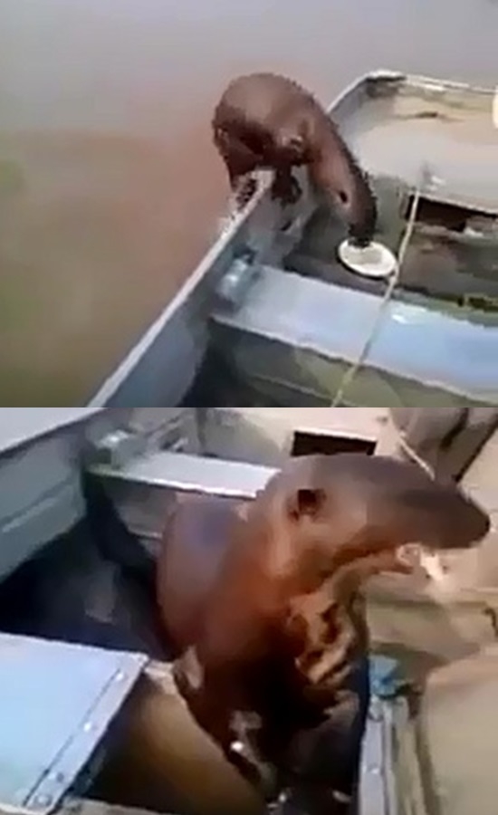 그리고는 배 위로 점프해 오른 녀석, 갑자기 배 안의 낚은 물고기를 제 먹이처럼 거리낌 없이 먹어대는데요.