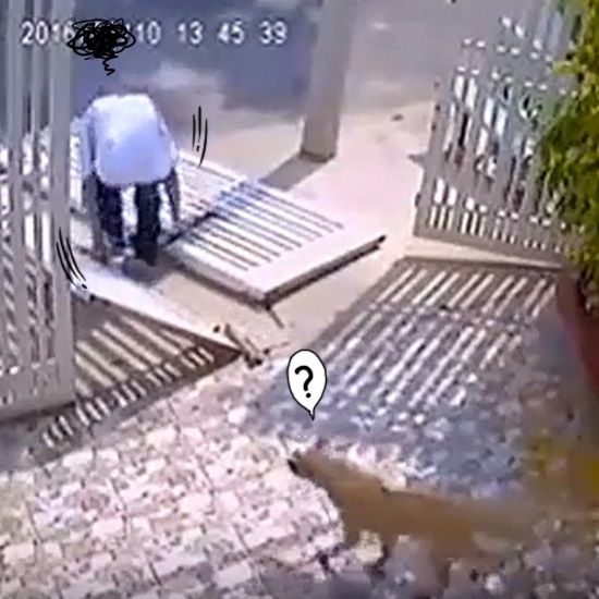 잠시 후, 빈틈이 보이기 시작한 하얀 철제문이 조금씩 열리는 순간, 갑자기 연결부위가 분리되면서 도둑을 향해 덮칩니다.