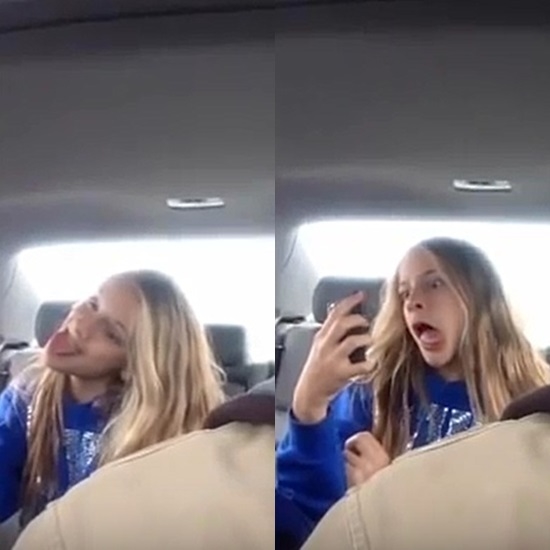 아빠 차량의 뒷좌석에서 온갖 표정을 짓고 있는 다 큰 딸.