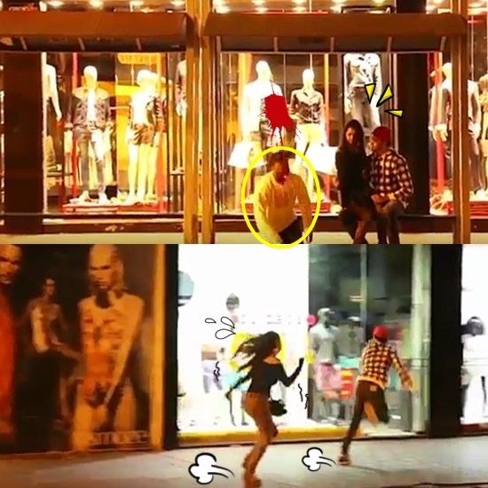그리고 순간 발사(?)되는 총! ‘탕!’ 총소리 효과음과 함께 스텝 남성의 쓰러지는 리얼 연기가 주변 사람들을 아연실색케 합니다.