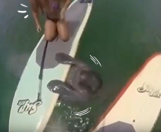 패들보드를 즐기던 여성에게로 검은 그림자를 띤 무언가가 다가오는데...