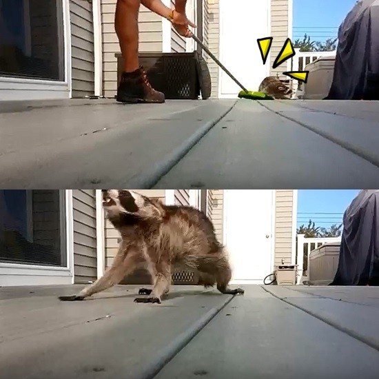 빗자루를 이용해 녀석을 밖으로 유인하는데 성공은 했지만, 녀석의 반발심도 만만치 않습니다.