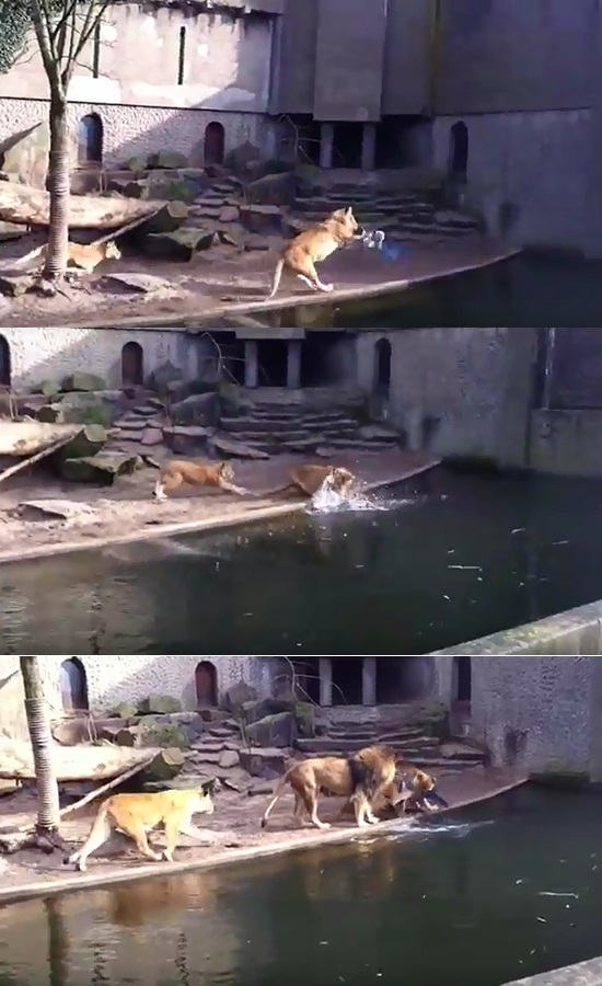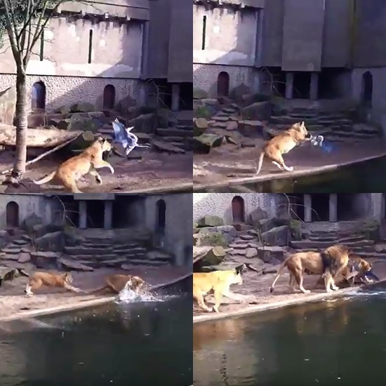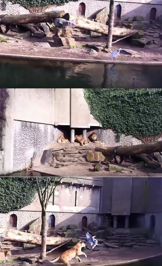 동물원 사자 우리를 침범한 새 한 마리를 포착한 사자 일가족, 가만둘 리 없죠.
