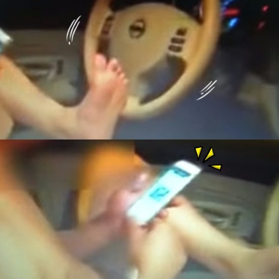 게다가 운전자의 시선은 전방과 양손에 쥐어진 스마트폰을 번갈아가며 향하고 있어 더욱더 아찔한 장면을 연출하는데요.
