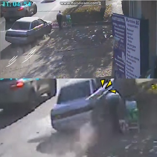 러시아 남서부에 위치한 로스토프나도누의 한 도로, 상가에서 남성이 나오더니 엎어져있는 광고 설치물을 세우던 찰나 느닷없이 차량 한 대가 쏜살같이 질주해 와 남성의 옆을 가까스로 스치듯 피해 사고를 냅니다.