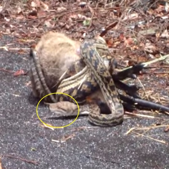 호주 퀸즐랜드주 케언스에 위치한 모리스 호숫가에서 발견된 이 장면에서 어린 캥거루를 옴짝달싹 못하게 목을 옥죄고 있는 비단뱀은 아주 여유만만인데요.