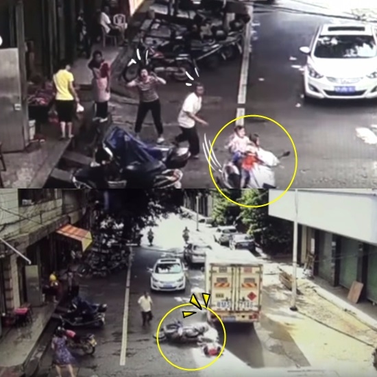 이 충격으로 앞뒤로 타고 있던 손자들이 나가떨어지고, 화들짝 놀란 할아버지와 주변 사람들은 서둘러 아이들을 구조하며 상태를 확인하는데요.