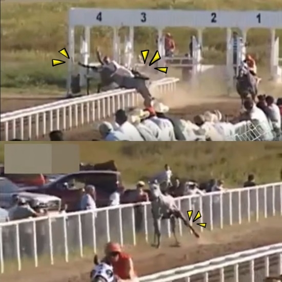 나가떨어진 기수는 의식을 잃고 쓰러지고 경주마는 왼쪽 다리가 흐물거릴 정도로 완전히 부러져 너덜거리는 상태로 달립니다.