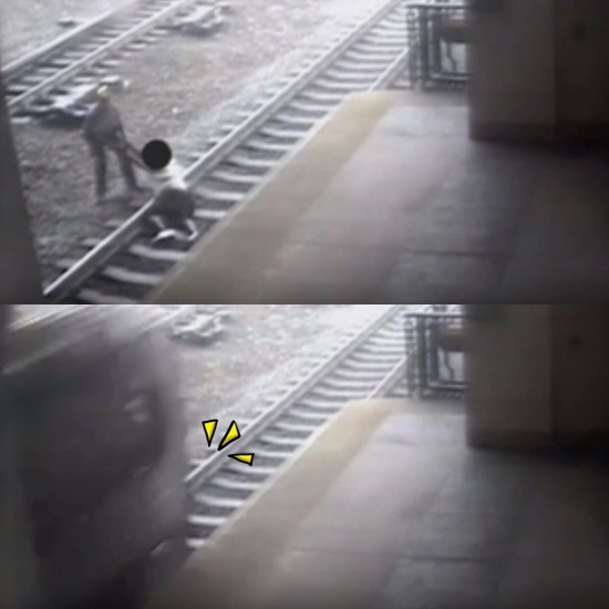 기차가 접근하고 있음을 감지한 경찰관이 서둘러 이 남성을 철로 밖으로 끌어당겨 보지만, 체격이 제법 큰 남성은 드러누운 채 오히려 위험한 상황으로 몰고 가려합니다.