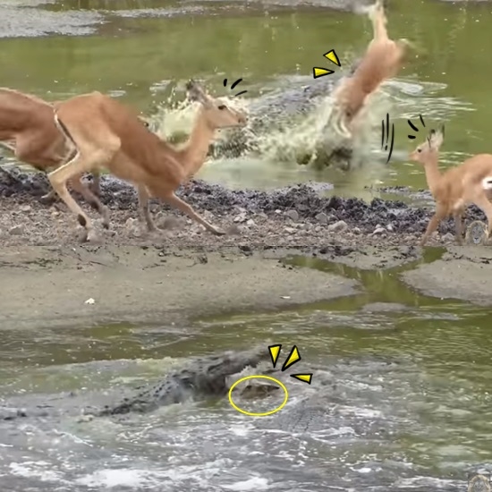 그 중 시야가 어두운 새끼 임팔라가 겁도 없이 물웅덩이 안쪽에 발을 디디는 순간 때를 기다렸던 악어가 덮치면서 새끼의 다리를 덥석 뭅니다.