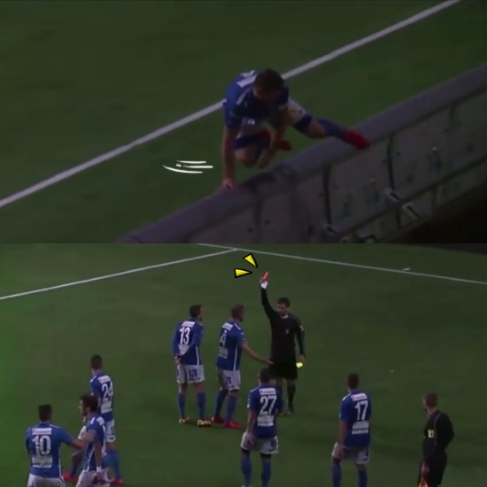 [쿠키뉴스=콘텐츠기획팀] 스웨덴 프로축구에서 골을 넣은 축구선수가 자축 세리머니를 하다 퇴장 당하는 황당한 장면이 포착됐습니다.