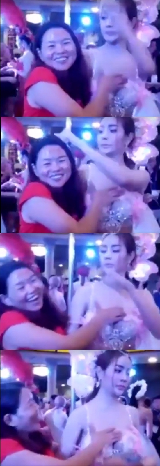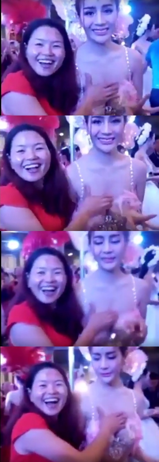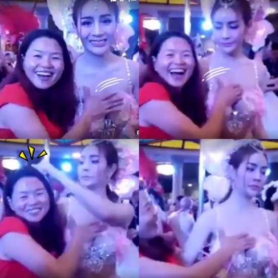 중국인 여성 관객이 쇼 관람 후 무희와 기념 촬영을 하는데, 느닷없이 무희의 가슴에 손을 갖다대고는 마구 문지릅니다.