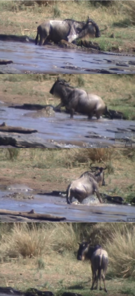 그리고는 서둘러 뭍으로 올라서는 누 녀석, 천만다행으로 목숨을 건질 수 있었는데요.