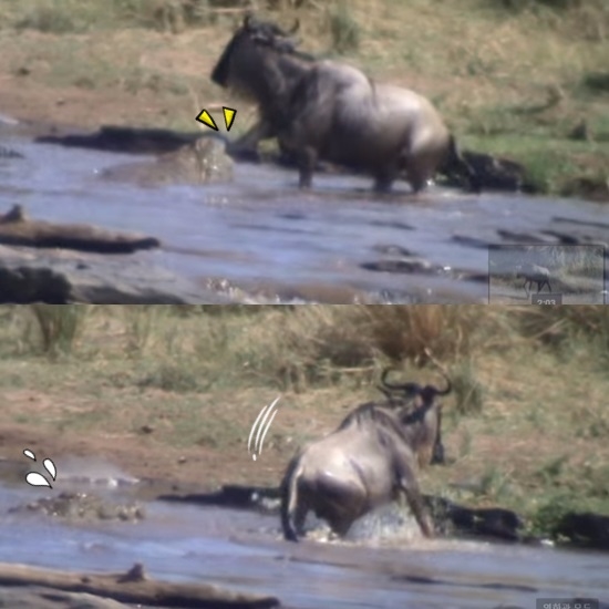 한참을 버티던 누 녀석, 최후의 발악을 하며 앞발로 악어의 머리를 강타하자 이내 물려 잡혀 있던 다리가 풀어지는 행운을 낳습니다.