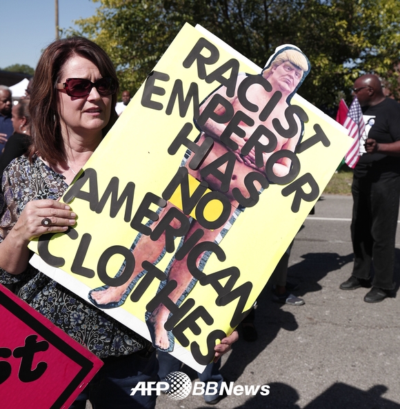 [쿠키뉴스=김진환 기자] 미 공화당 대선후보 도널드 트럼프가 3일(현지시간) 미시간주 디트로이트의 한 흑인교회를 방문해 지지를 호소했다. 이날 교회서 트럼프의 연설이 진행되는 동안 교회 밖에서는 트럼프 반대시위대가 이어졌다.