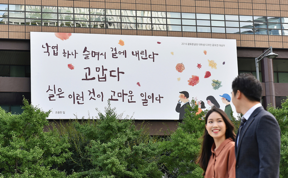 이번 가을편은 ‘광화문글판 대학생 디자인 공모전’ 수상작으로 꾸몄다. 이번 공모전에는 국내외 대학생 310여명이 참가해 높은 관심을 보였다.