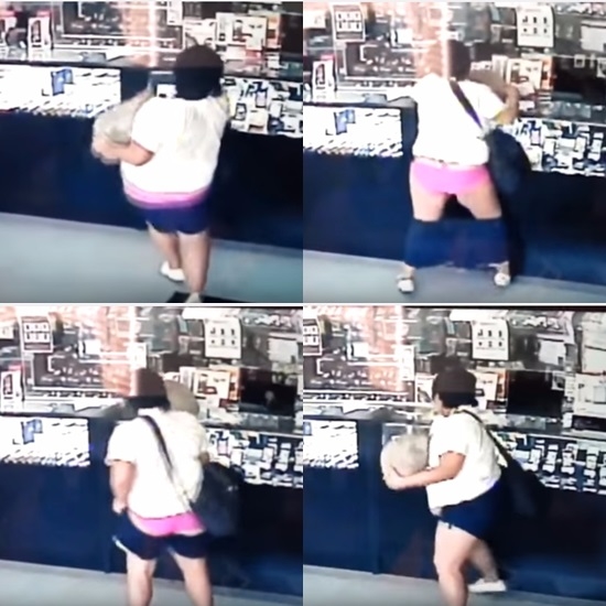 이내 다시 시도하는 여성은 돌덩어리로 진열장을 부수고는 몇 대의 폰을 집어 챙기는데요.