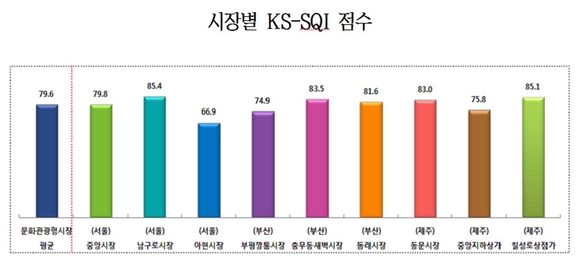 이번 조사 결과 문화관광형 시장의 평균 KS-SQI는 79.6점으로 나타났다. 올해 7월 6일에 발표된 KS-SQI 결과와 비교하면, 이 수치는 상반기 조사대상 업종 중 최상위 업종인 호텔(86.5점)과 무인경비서비스(85.1점) 다음으로 높은 수준이며, 이어 발표했던 5대 전통시장의 KS-SQI인 81.4점보다는 다소 낮은 수준이다.